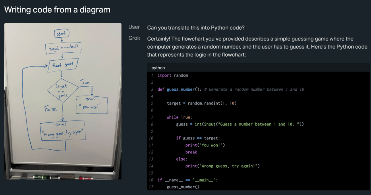 Versatile Applications: Grok-1.5V is capable of tasks ranging from writing code from drawings to calculating calories from food photos, and even offering home maintenance advice.